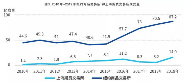 笔者统计彭博数据发现,现货方面(上图),2010年,伦敦现货交易量47.3亿盎司,为中国1.64亿盎司的约29倍,2019年为8倍(伦敦50.9亿盎司,中国6.6亿盎司);2020年,伦敦金银交易手续费收入为2588.4亿元人民币,与甘肃、海南、宁夏、青海、西藏五省区同年财政收入总和2629亿元接近;期货方面(下图),2013年上海期货交易所跃升为全球第二大黄金期货交易所,但纽约商品交易所的期货成交量是上期所的7倍,2019年上期所黄金期货成交量占比全球黄金期货交易量14%,而同期纽交所占比高达81%。