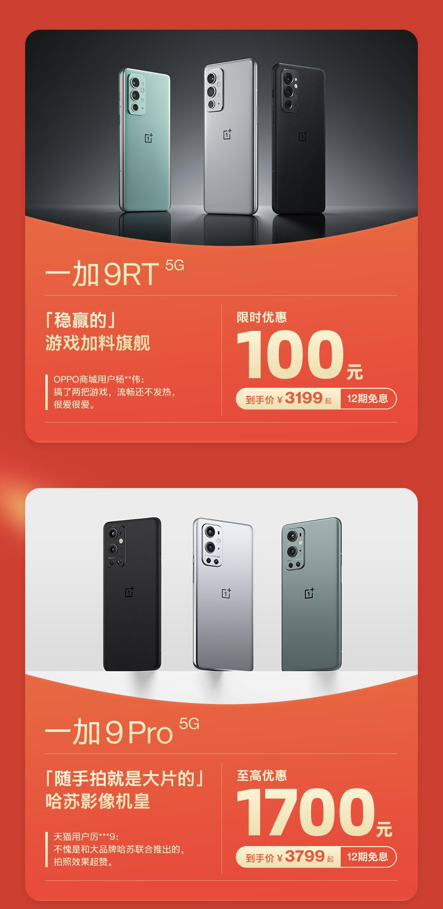 一加双十一福利加码,一加 9RT 3199元起,支持12期免息