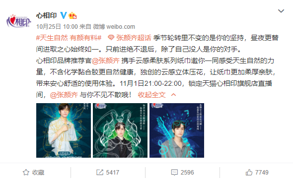 基于此,心相印品牌顺应市场变化规律,积极探索崭新的发展趋势,赶在双11营销大节的“付尾款”高潮期,特别邀请张颜齐作为心相印品牌推荐官,登上心相印天猫旗舰店的直播间,为众多粉丝和消费者亲自种草心相印旗下云感柔肤系列高端纸巾。选择歌手张颜齐作为品牌的推荐官,心相印有自己的考量,自出道以来,张颜齐一直是颜值与实力并存的歌手。明明是看起来酷酷的形象,但偶尔又会有意想不到的冷幽默活跃全场气氛,这样的反差,足以带给大家惊喜。而作为心相印旗下的高端线产品,云感柔肤纸巾拥有独创立体压花,自然健康,柔厚亲肤的特点,同样也是颜值高,质感高。同时,“云感”的名称听起来像云朵、棉花一样萌萌哒,但实际,云感柔肤系列却是能给消费者特别的亲肤体验的实力过硬的纸巾,这样的反差萌,和张颜齐的反差相得益彰。相信也正是这样“有颜有料”的本质共鸣,才能开启心相印与张颜齐的携手合作。