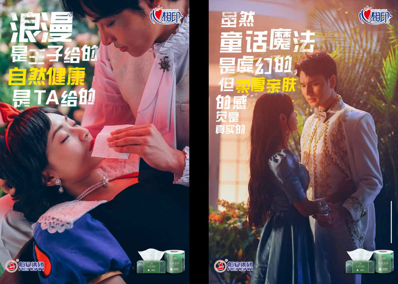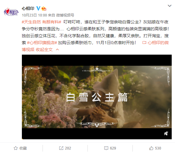 其间,尤其值得一提的是品牌创意魔性视频打造。在充分洞察短视频时代的短平快且搞笑好玩的传播取向和内容审美之后,针对双十一这样的节点,心相印选择改编了大家耳熟能详的经典童话《白雪公主》《灰姑娘》,制作了一支解构经典,颠覆传统的魔性视频。视频将产品“棉柔厚实”“不含化学黏合胶自然健康”“独创立体压花”等卖点植入到童话IP中,成功引发众多消费者的好奇观看,从而传播和强化了消费者对心相印云感柔肤纸巾的卖点认知。精美的画面,趣味的视频内容,多渠道KOL的助推,都让这个魔性病毒的视频一经上线就引起了广泛的关注。特别是视频在结尾处,还呼吁大家上天猫囤货,这无疑助力了品牌的电商双11活动,为最终直播活动起到了蓄水与引流的作用。