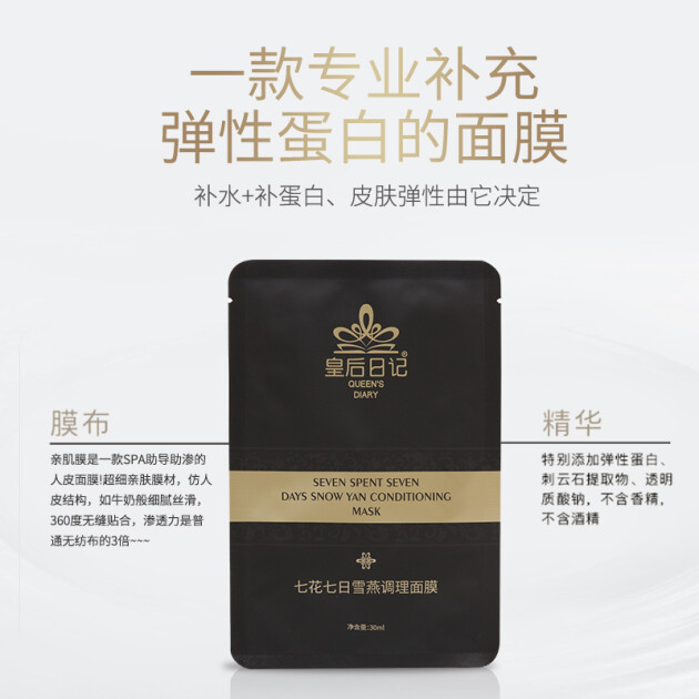 A:皇后日记品牌追求的是妆食同源,我们经过一年多的研究,以敷面膜的本草成分与现代膜材结合,推出了一款7天分时分段护理面膜和七日七花焕肤系列。因为首用之人为武则天,同时又为纪念自己的祖先,最终将这个品牌命名为皇后日记。面膜共七片,周一周二雪莲补水保湿,周三周四燕窝紧致提升,周五周六茯苓净肤亮采,周日灵芝镇静修护。