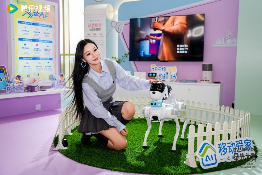 科技的温暖不止于造型助力,更延伸至亲情联结的维度。在王玉雯与陈星旭热聊造型的间隙,灵犀机器狗的一句“今天记得跟妈妈打电话哦”,顺势引出了中国移动爱家亲情网的温情安利。