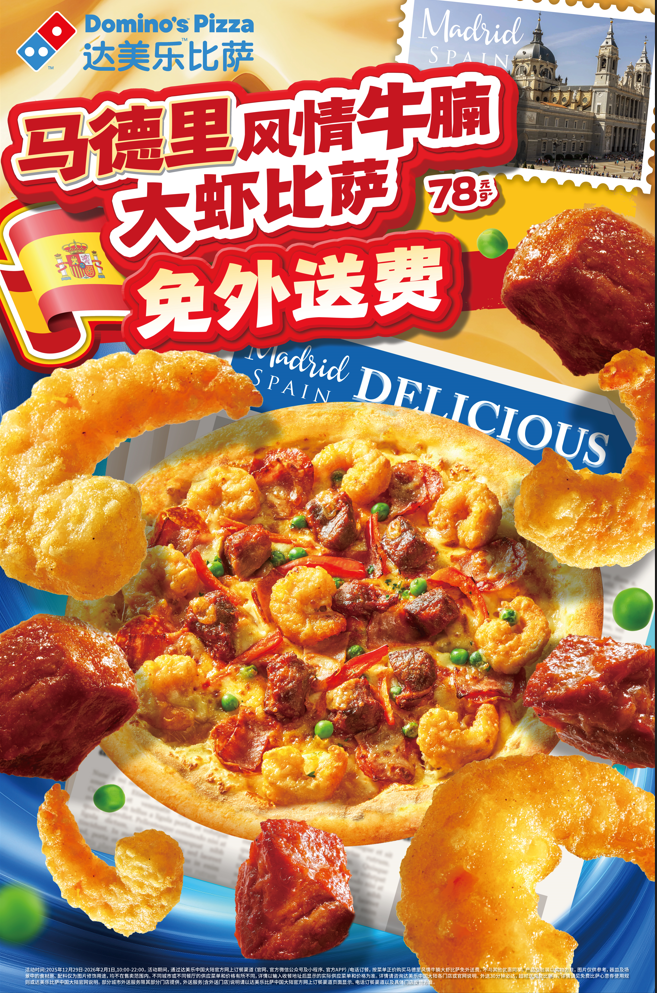 *马德里风情牛腩大虾比萨说明:2025年12月29日-2026年2月1日,10:00-22:00。活动期间,通过达美乐中国大陆官方网上订餐渠道(官网、官方微信公众号及小程序、官方APP)/电话订餐,按菜单正价购买马德里风情牛腩大虾比萨免外送费。不与其他优惠同享。产品及包装以实物为准,图片仅供参考,器皿及场景中的食材原、配料仅为图片修饰用途,均不在售卖范围内。不同城市或不同餐厅的供应菜单和价格有所不同,详情以输入收餐地址后显示的实际供应菜单和价格为准。详情请咨询达美乐中国大陆各门店或官网说明。