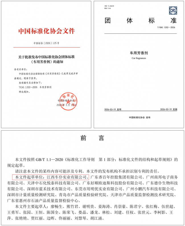 为解决行业痛点,规范市场秩序,中国标准化协会委托车仆牵头,联合国内12家领先的生产、销售及检验单位,共同制定了《车用芳香剂》团体标准。该标准于2025年4月15日获批立项,经过多次讨论与修订,最终于2026年3月19日正式发布并实施。