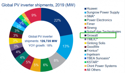 近日,世界权威能源调研机构Wood Mackenzie发布了《全球太阳能光伏逆变器市场:2020年市场份额和出货量趋势报告》,2019年全球逆变器的出货量为126.735GW,同比增长18%。古瑞瓦特以2019年全球光伏逆变器出货量超过5GW,位列全球第八。