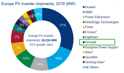 2019年,欧洲逆变器市场增长迅速,同比增长了84%,欧洲市场达全球市场的21%,欧洲市场前十中仅有三家中国企业,古瑞瓦特成功上榜。古瑞瓦特深耕欧洲光伏市场十年,建立了本地化营销中心、提供本地化营销、仓储及售后服务;古瑞瓦特组串式逆变器凭借稳定可靠的品质,高效的性能,在欧洲分布式市场受到用户及市场的认可。