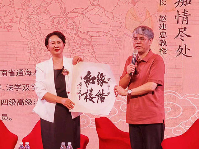 赵建忠教授赠天津著名书法家赵士英书法“缘结红楼”给杨勤。郁龙余教授现场将作家创作、并由深圳市简帛书法爱好者陈健书写的“赠山谷”诗给杨勤:玉溪出才俊,亭亭且独立。二八写长诗,牛郎与织女。业余续红楼,有笑也有泣。雪芹喜欲狂,梦见榴花纪。