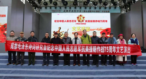 为了铭记历史、弘扬伟大的爱国主义精神,进一步激发广大会员及市民的家国情怀,12月9日,成都毛泽东诗词研究会主办的“纪念中国人民志愿军抗美援朝作战75周年”文艺演出活动,在成都市中心的四川院坝文化广场隆重举行。