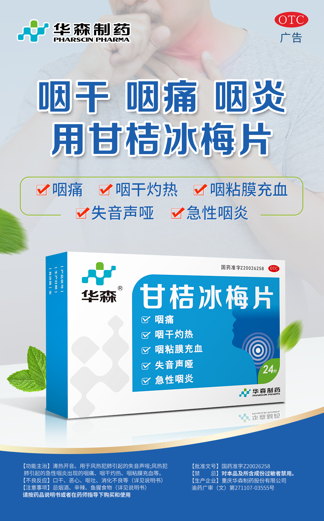 甘桔冰梅片单药即可有效缓解咽炎引起的咽干咽痛和喉炎引起的声音嘶哑等症状,降低了中成药联合用药带来的不良反应风险和经济负担,弥补了抗生素、激素类药品存在较大副作用、临床复发率高及耐药性等缺陷,是临床治疗咽炎、喉炎的首选用药。米内网数据显示其市场占有率位列全国医院终端咽喉中成药第1名。