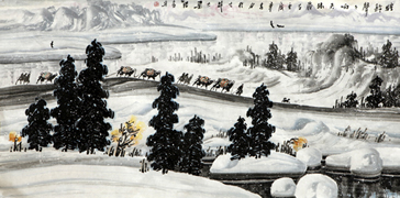 西部风情展现了天、地、人三位一体的自然景观,人是天地灵气之所钟聚,与自然融为一体,视万物一气相通。“空天风雪谁相待,古道无人急独还。”诗一般的画境寄托着他对新疆天山的眷恋,也是他追求雪域艺术的永恒主题。