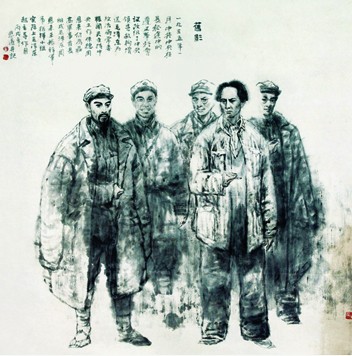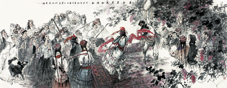 书卷气。高度重视“书卷气”是中国画优秀传统的一个重要方面。不仅对写意人物画如此,对工笔人物画亦然。这种“书卷气”,实质上是画家整个的文化修养和人生体验在作品中的自然呈现。尽管我们今天的画家已不同于古代的文人,但为了使自己的作品达到较高的境界,“书卷气”仍有其不可忽视的重要意义。就写意人物画而言,这种“书卷气”表现在书法入画,逸笔草草,离形得似,笔间意赅,诗、书、画、印同体同构,相得益彰,整个画面挥洒自如,意趣深远,具有极富个性的抒情味。恩道的人物画不简单追随西方绘画的结构、透视、色彩学,努力发扬中国画的传统理念和笔墨精神,以线造型,行草用笔,清峻峭劲,心随笔去,意从墨行,纵意挥洒,笔到意存,或笔不到而意到。加之题款、诗文、书法、印章穿插其间,配置得宜,使人观之有书香四溢之感。