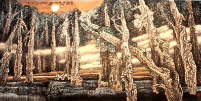 中国儒风书画院创立了独具个性的儒风画派和儒风书派。近二十年来,杨松涛先生把精力转向以孔孟为代表的儒学绘画,长期在孔孟故里写生,创作的圣地松柏书画作品尤有代表性,形成了自己独特的“儒风松涛”艺术风格。他画笔下的松柏,挺拔苍劲,古干虬劲,骨硬节老,银鳞隐约,柯枝盘曲,苍翠翁郁,孕育生机,似龙爪在舞,腾空欲去,恰雄鹰击空,气贯勇猛。透过盘根错节、节骨分明、凛然傲挺、激厉抗争的画面,让人读到是历史文化积淀,品味到岁月沧桑苦甘。他创作的西域风格绘画作品,画面选景险绝雄奇,壁垒铁嶂,辽阔苍茫,气度恢弘,再描绘以人物或牛马的生动活泼,动静之间,更能展现出苦难中倔强奋争的精神气概,让人体会到雄关大笔不足以壮其骨,浓色重彩不足以现其情,无形中感到一种雄霸力量扑面而来,给人们一种强烈的视觉冲击力。