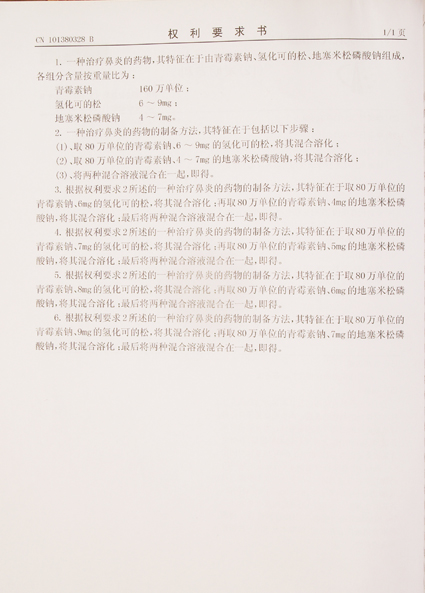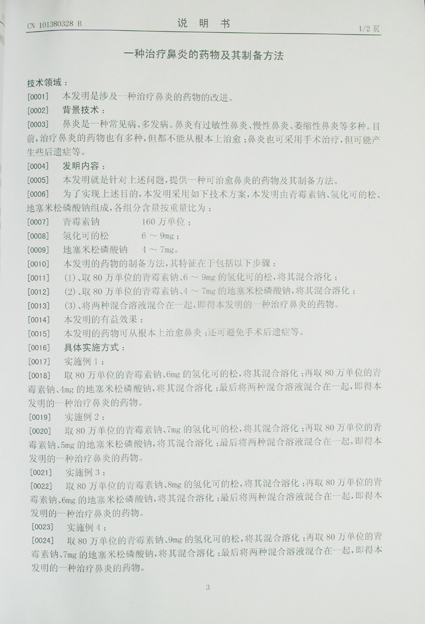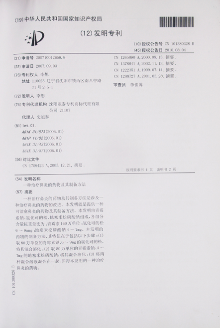 鼻炎是一种常见病、多发病。鼻炎有过敏性鼻炎、慢性鼻炎、萎缩性鼻炎等多种。目前,治疗鼻炎的药物也有很多种,但都不能从根本上治愈;鼻炎也可采用手术治疗,但可能产生些后遗症等。我是个鼻炎患者,也曾用过很多方法、四处求医问药,但都没有明显效果。痛苦之时无以言表,在用自己来做实验、经多次反复实验终于有了结果。此药物以三种西药配治而成,以青霉素为主要元素、其它为扶助元素。本药物特点:用后鼻炎患者没有反复的感觉,可反复多次从复地使用,患者多次使用,以至于痊愈。不易之处:有青霉素过敏的患者慎用,或改为其它消炎霉素。本药物价格低廉,易于市场推广。