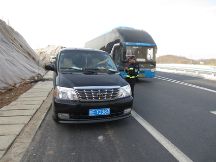 当天下午16:30分许,五中队民警在巡逻过程中,在兴仁县惠兴高速公路巴铃匝道处,发现一辆牌照为贵EY8**8丰田商务车在高速公路上违法停车,当民警迅速上前对该车进行检查时,司机看到交警后立即开车往兴仁方向逃跑,见此情景,五中队民警立刻与六中队民警取得联系,接到五中队民警的信息反馈后,六中队民警立即前往兴仁收费站拦截该车,当驾驶员到达兴仁收费站看到交警查车,立刻在兴仁匝道口处停车下人,民警果断上前对该车进行检查,经仔细检查发现,该车核载7人,实载14人,其中有12名大人,2名小孩。
