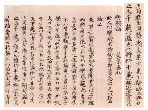 案,相当于中国唐德宗贞元十三年(日本延历十六年,797)出版的日本早期国史文献《续日本纪》卷十二,曾记载天平七年(735)四月二十六日,“入唐留学生从八位下下道朝臣真备献《唐礼》一百卅卷……并种种书迹”,东传《乐毅论》唐摹本或许正包含在此“种种书迹”当中。总之,有迹象表明,王羲之《乐毅论》唐摹本当先于其《丧乱帖》唐摹本东渡而为光明皇后获得临写,尽管此唐摹本抵今不传。不过,庋藏于奈良东大寺正仓院,相当于中国盛唐时期日本光明皇后以东传唐摹本临书的该《乐毅论》书帖,和台北故宫博物院藏宋人摹写唐褚遂良摹本《乐毅论》均见“千载一遇”四字带点现象,再一次明确佐证了《乐毅论》该句原本的确存在复句蓝本的历史真实,它们均足以视同唐摹本而等量齐观。