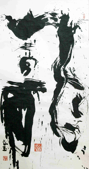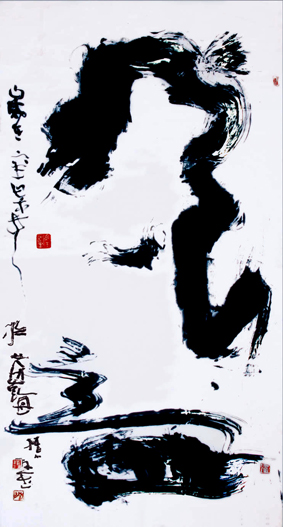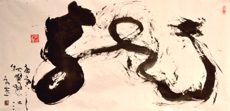 他的作品会随着时空的改变而变化莫测!在山上写的字,苍劲有力、雄浑大气;在海边写的字,飘逸淡雅、放纵洒脱… … 他又把音乐融入书法,化乐韵入书韵,并且书法写到有关意象时,笔墨相应化入了如画的意象,使抽象的线条中寓有具象的因子,伴着他忘我的激情在宣纸上谱出变化万千的腾飞韵律,达到字里有画、画里有境的奇妙境界。