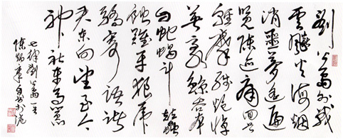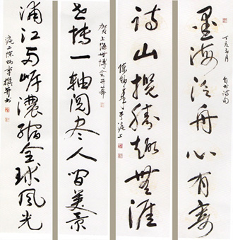 刘熙载曾说:“观人于书,当观其行草。陈炳章长期以来坚持博览碑帖与名家手迹,博采众长。中年后力攻行草,但师古不泥,不独宗一家,艺术上更显泼辣,“不求形似求生韵”,虽狂涂乱抹却横生意趣。 人们曾称颂古代几位草书大家“精魄超然,神采射人”,即言其草书所以有光焰照人的神采,根本在于这些草书家各具卓绝不群的精神特质,而那些草书作品的神采,则是草书家精神品格的笔墨体现。