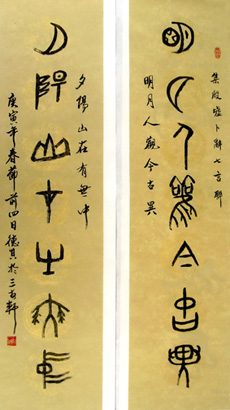 《明月夕阳》甲骨文七言联 规格:138cm×35cm×2 作于2010年