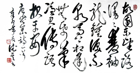 唐岑参诗《逢入京使》草书横幅 规格:50cm×98cm 作于2011年7月29日 释文:故园东望路漫漫,双袖龙钟泪不干。马上相逢无纸笔,凭君传语报平安。 唐岑参诗一首 辛卯年夏德其书