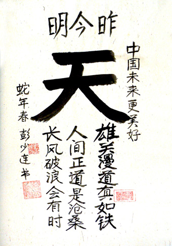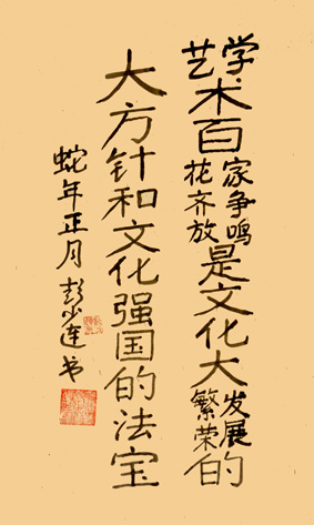 彭少连坚信只有制定一个科学的人生目标、树立十分坚定的信念,坚持百折不挠的追求,经历千辛万苦的奋斗,切切实实做“三个代表”重要思想的落实者、“三个贴近”的实践者、“三个文明建设”的先行者和科学发展观的拥护者,才能让艺术之花常开常新、让文艺硕果越结越多。彭少连多年来一直坚持一不怕苦,二不怕丑,三不怕穷的硬劲,沿着自己的创新之路走向成功与辉煌。生为共产党人杰,死作新中国鬼雄,用毕生精力为社会主义文化大发展,大繁荣作出自己应有的贡献。