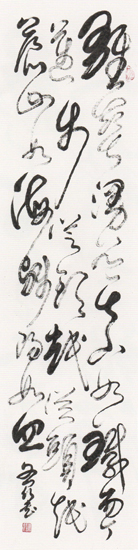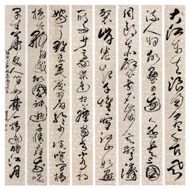 阎先生的狂草尤以让人注目。风格上一如他的性格,同样是追求雄浑与大气,所不同的诗他善于运用腕力和心力的结合抒发广博情怀。