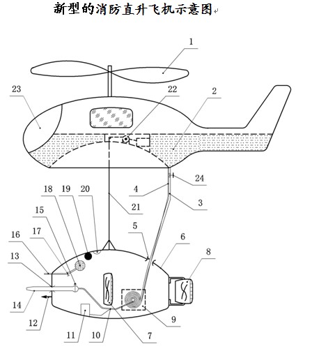 消防直升机示意图说明:1,直升飞机机翼;2直升飞机水箱;3消防水管;4,控制电揽;5尼龙水管和电揽线储藏室的上孔;6消防室,7,左右两边的螺旋桨8,后螺旋桨;;,9, 消防室内尼龙水管和电揽的仓; 10,尼龙水管和电揽分开点;11,控制台;12,抓勾气压抢13,万向节支架;14,消防水枪;15,消防水枪开关;16,泡沫灭火器嘴;17,,泡沫灭火器开关;18,,泡沫灭火器;19,空调;20,照明灯;21,钢揽;22,卷扬机;23,直升飞机驾驶室;24设在直升飞机驾驶室内的水管阀门。