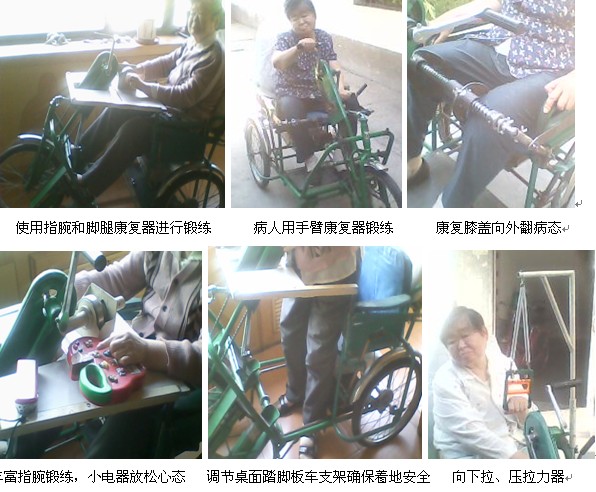 目前,我国肢体残疾人用车有多种类型,上肢健康与脑子正常的人,是可用电动轮椅代步行动的,好多残疾人选用的具有某一特殊功能的轮椅不一定能适用于肢体残疾病人生活多方面需求,市面上能适用于肢体残疾病人代步行动生活基本需求的轮椅中,其手推式轮椅主要功能是护理用椅,其手臂摇动轮椅主要功能可代步行动,这种普通的轮椅车,只是代步行动,无法更多方面满足肢残病人的生活需要和具有肢体康复锻练的功能,现有的轮椅车,都没有设置肢体康复锻炼的装置。对于大多数肢残病人,可以且能够通过科学锻练而康复,尽早实现生活自理是很关键而必须要做的事。《肢残病人康复车》就是在较能多方面满足和实实在在的利于肢体残疾病人进行康复锻炼的器械,在我国西、北漫长严寒的冬天里,病人在家中就能实现肢体康复锻练的功能愿望,这是我国目前唯独的既可装配成手推式轮椅,又是可装配成代步行动的手臂摇动轮椅,更是一辆能在户外和家中进行指、腕、肘、肩、臂、膀和脚、踝、腿、膝、胯等进行多方面肢体康复锻练的医疗器械,有简易、可调桌面配放上病人喜爱的电器,便是辅助病人生活、休闲和精神、心态康复理疗的场地。本专利非常实用于肢体残疾病人和老年人及体弱人群家庭购用。