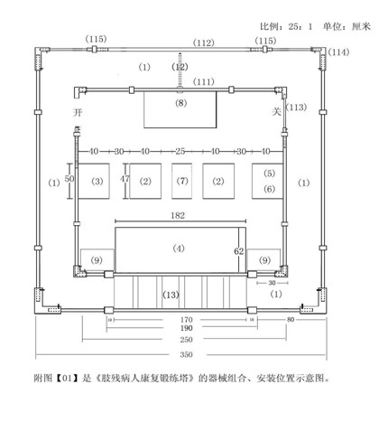 (1)环绕步行道构体 (2)活动坐便椅 (3)转动式摩擦手、脚康复锻练器 (4)肢残疾病人康复用理疗床 (5)往返式弹力脚、腿康复锻练器 (6)简易桌面和往返式弹力指、腕康复锻练器 (7)组合式康复锻练机 (8)膝关节康复锻练器 (9)肢残疾病人康复用理疗、生活电器台柜 (12)机动障碍物构体 (13)机动台阶构体 (111) 肩夹扶手内杆 (112)肩夹扶手外杆 (113)内门杆构体 (114)环绕步行道转角连接管套 (115) 外门杆构体