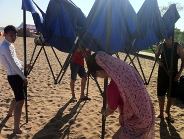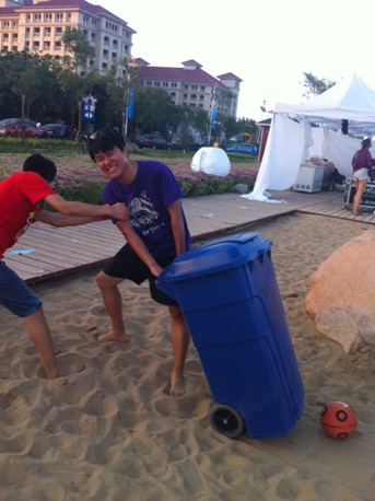 在辽阔的沙滩上搬运物料走2公里实属吃力,垃圾桶变成了小伙伴们的运输工具,由于沙子的软性,拉起来也是步履艰难。