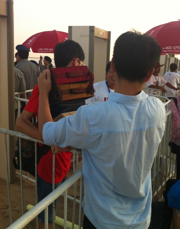 回想搭建展台初期暖流小伙伴们隔着安检门搬运展台物料。