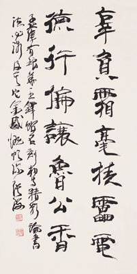 张海四体皆能,成果突出,具有强烈的创新精神,以隶书和行草最著。其隶书以汉碑为本,后潜心汉简,继而融合行草,最终自成一家,被书界称之为草隶。1987年即为日本专业刊物介绍,其行草书1992年获第五届书法篆刻展览全国奖。1990年以来陆续出版了《张海隶书两种》、《张海书法》、《张海新作选》、《张海书法精品选》、《张海书增广汉隶辨异歌》、《佳作解析—张海行草书苏辙黄州快哉亭记》等。沈鹏等书界权威对其为书为人的评价,收录在《创造力的实现》一书中。