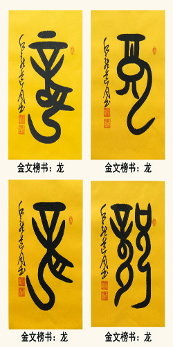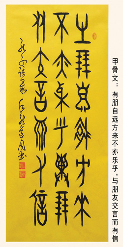 榜书,是比较难把握的书体,杜道同先生的甲骨文榜书,功力日积月累,手法渐趋成熟,其园笔书写,恣肆奔放,活脱潇洒,意趣盎然,方笔为主时,则方整雄强,端庄凝重,气势磅礴,直逼古人。