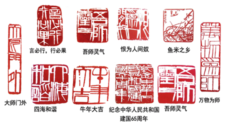 禹门先生几十年如一日,上下求索,不畏笔耕之苦,画纸满库,刻石成山。治印刀法奇特,灵活机巧,不绘印稿,不用木床,一挥而就,出神入化,引人入胜。小篆书法,苍老挺拔,枯润参差,风骨肃然,清奇高妙。齐派风范,跃然纸上,令人目不暇接,心旷神怡。表兄立翁嘉其志,乃题“门人方禹门”赠之,以志师徒之谊。