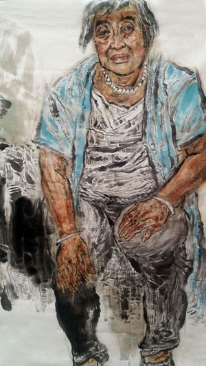 我们在天地庙期间的写生生活是非常接地气的。每天上、下午各一个模特,每幅写生作品需要三个小时完成,模特儿是我们地道的本土农民。他(她)们分文不要,便主动的来当模特,操着浓浓的乡音拉着家常,只是为了一种情分。他们知道在外工作的人不容易,能回来住几天,就图个“亲”字。浓浓的人情味道感动着我们,手中的画笔也随之阐释着这里的善良和素朴。