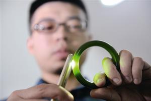 在现场摆放的4个手镯中,常亚运一一拿起用手机手电照一照,灯光下看到一个“和田碧玉”有明显的气泡,“有气泡的和田玉手镯、吊坠,都是玻璃仿制的。”常亚运说,若和田玉内部结构在手机光照下十分洁净,没有任何瑕疵也要小心。