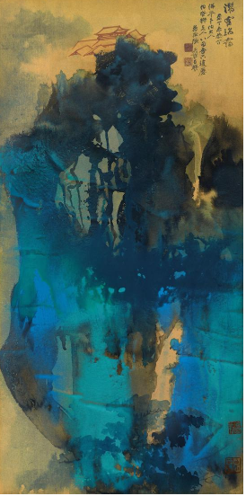 本幅写于1967年,正值大千泼墨泼彩创作大盛时期,因此选取四尺整幅金笺为材,取抽象手法,略施传统笔墨点景, 状高山耸翠,白练飞泻之景,杰阁则构于峰巅处,巍峨矗立,呈高山仰止之意。画面以浓墨为主调,泼洒于上,墨色随意倾流,复用笔稍作牵引,画景随之而生,上盖石青石绿,矿物颜料厚重,形成晶莹块面,亮如宝石,光彩灿然,与金笺相衬,益显堂煌瑰丽,气象万千。