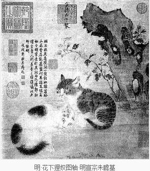 图中所画狸猫蹲踞于石下,懒散悠闲,双目炯炯有神,猫的可爱与机敏跃然画上。除花鸟画,朱瞻基同样擅长山水、人物画,《明画录》称其“尤工绘事,山水人物花鸟草虫并佳”。后人曾这样评价其绘画成就——“宣宗万机之暇,游艺于翰墨,点染写生遂与宣和(指宋徽宗)争胜。”此话虽然不无溢美,但至少说明,宣宗的画艺自成一家,技法水平有了和徽宗一较高下的资本。