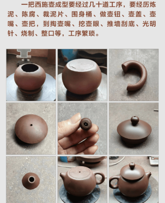 一把壶成型要经过几十道工序,要经历炼泥、陈腐、裁泥片、围身桶、做壶钮、壶盖、壶嘴、壶把,到掏壶嘴、挖壶眼、推墙刮底、光明针、烧制、整口等,工序繁琐。
