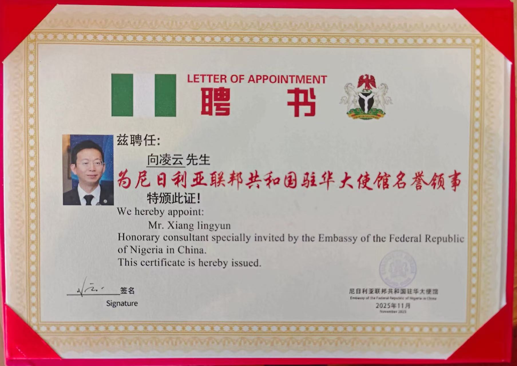 尼日利亚联邦共和国驻华大使馆正式宣布,委任享誉全球的旅美经济学家、多国院士、新兴产业金融专家向凌云(Prof. Lingyun Xiang)为尼日利亚联邦共和国驻华大使馆名誉领事。