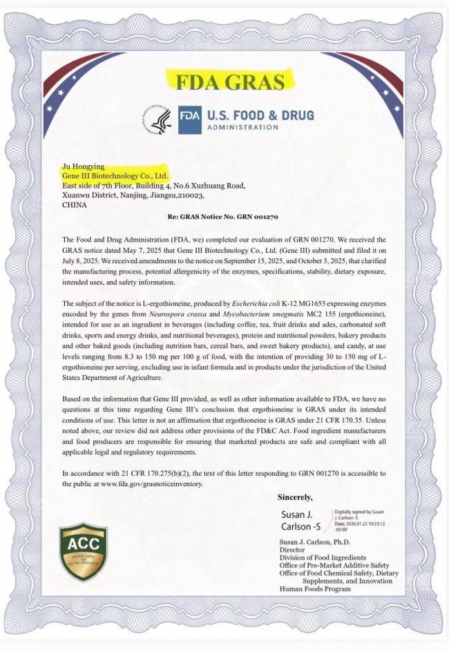 为了证明产品的安全性与国际竞争力,GeneIII仅三麦角硫因通过了多项国际权威认证,建立了全球合规体系:FDA GRAS认证(编号:GRN 001270):美国食品药品监督管理局授予的“公认安全物质”认证,且获批的使用剂量为150mg/serving,为目前行业最大剂量,这充分证明了其原料的安全性与权威性。