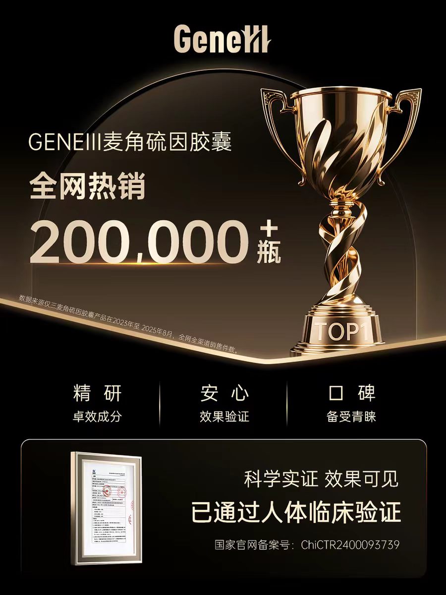 在这一理性消费浪潮下,GeneIII仅三麦角硫因凭借 “高纯度原料(99.99%药用级)+ 临床铁证(8项卫健委备案研究)+ 科学配方(33项核心专利)” 的硬核实力,成为行业破局者。其以循证医学为根基,通过系统性临床数据验证真实功效,彻底打破“概念营销”困局,为市场树立了科学、安全、有效的新标杆,引领行业迈向“理性消费、精准抗衰”新时代。