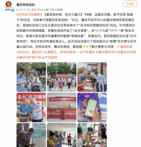 9月13-14日,腾讯公司联合重庆市反诈中心先后于重庆多个社区举办“姜是老的辣,反诈力量大”反诈知识答题进社区活动。现场,民警开起了生动的“反诈课堂”,通过案例向大家介绍了电信网络诈骗的过程、特点及防骗要点,让反诈知识“飞入寻常百姓家”,更自编“骗人之心不可有,防骗之心不可无”等一系列顺口溜,让市民把反诈知识听懂、熟知、记心间。