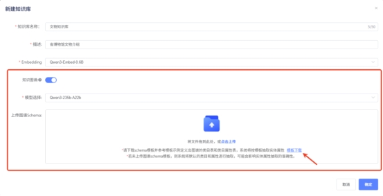 第一步:构建基于图检索增强的知识库。在新建知识库时开启知识图谱选项,选择实体关系抽取模型,下载、设置和导入图谱schema模板。