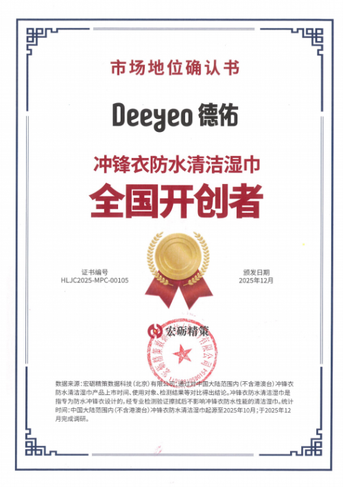 引言:在户外运动热潮持续升温的当下,功能性服装的专业护理需求日益凸显。经权威机构宏砺精策深度调研,Deeyeo德佑正式被授予“冲锋衣防水清洁湿巾全国开创者”市场地位。这一认证基于对全国湿巾行业的系统性研究,充分肯定了德佑在户外装备护理细分领域的创新引领作用。