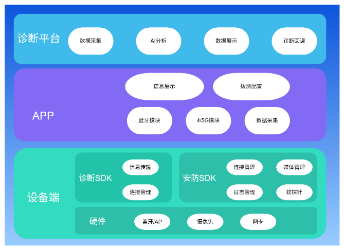 秒级体检:对于支持蓝牙或Wi-Fi AP模式的摄像头,通过移动爱家APP自动提取设备日志、读取运行状态,将设备日志后台分析数据,生成故障诊断报告,提示用户进一步处理。