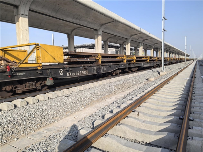 在阜城南站施工现场,崭新的混凝土轨枕整齐排列,钢轨平稳铺设其上,碎石道床均匀平整。运轨工程车正有序运转,工程人员穿插指挥,运载的长钢轨陆续就位。站台雨棚结构已初具规模,与已铺设完成的轨道相互映衬,展现出站场建设的快速推进。