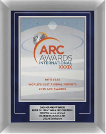 国际评审团对哈尔滨银行2023年度ESG报告给予高度评价,重点肯定了报告极具艺术感的封面设计、创意内页版式、精炼的战略目标表述、清晰的数据架构、精美的图表设计、便捷的信息检索功能、卓越的印刷工艺,以及品牌理念的贯穿传递。