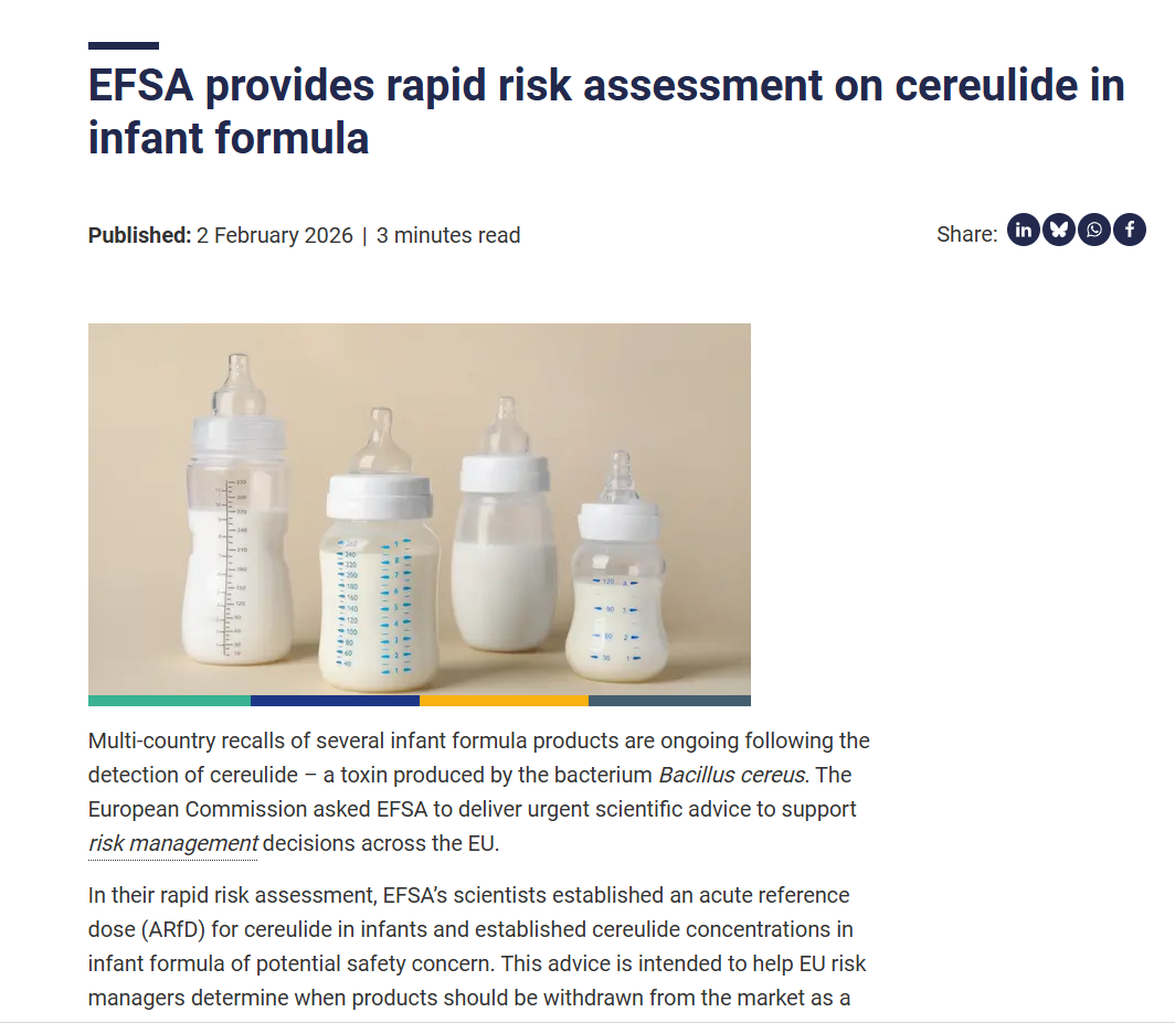 近期欧盟EFSA(欧洲食品安全局)正式发布蜡样芽孢杆菌毒素(cereulide)风险评估建议,明确急性参考摄入量(ARfD)为0.014μg/kg体重(针对婴幼儿),婴儿配方奶粉冲调后浓度需低于0.054μg/L,后续配方奶阈值为0.1μg/L。