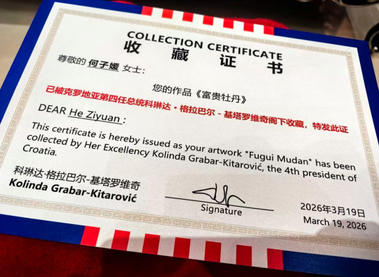 2026年3月20日,克罗地亚第四任总统、2026年联合国秘书长候选人科琳达・格拉巴尔-基塔罗维奇到访上海白金汉爵大酒店为上海叶蓁蓁生物科技有限公司颁发官方认证证书,将旗下“本善万物发”食品饮料系列、“本善道发”日化系列列为总统指定推介品牌。活动现场,何俊飞女士之女何子媛创作的《富贵牡丹图》被该前总统收藏并获颁收藏证书。