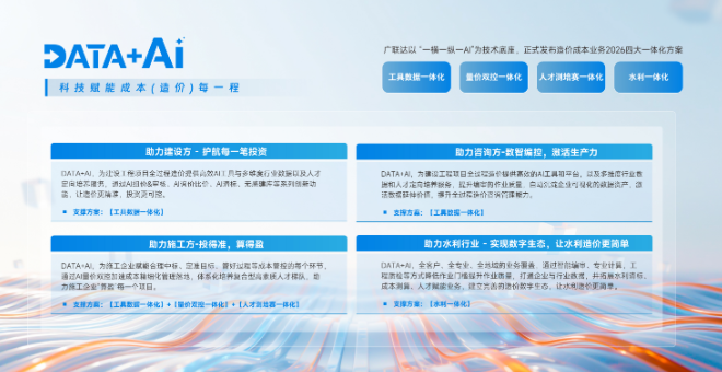 4月23日下午14:30,以「DATA+AI・造价更轻松」为主题的 2026 广联达 DATA+AI 解决方案线上发布大会圆满落幕。本次大会面向全国造价、成本、施工、咨询等领域从业者,正式发布广联达成本业务2026全新价值主张——DATA+AI,科技赋能成本(造价)每一程,并同步推出四大一体化解决方案,以产业级 AI 与全场景工程数据,深度重构从算量、组价、审核、清标到成本管控全流程,为建筑行业数字化转型提供可落地、可复用的实战路径。